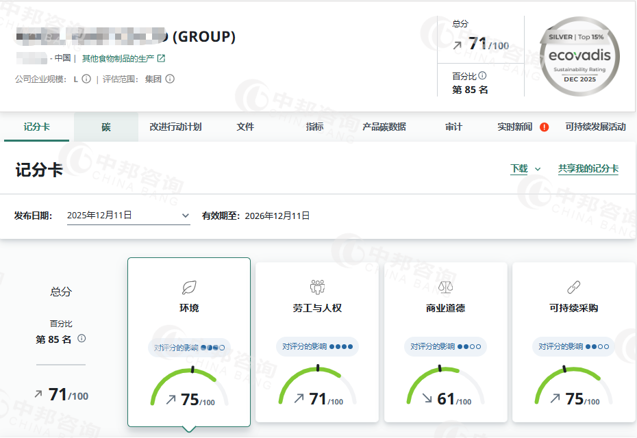 恭贺北京XX文化传播股份有限公司2025年11月EcoVadis取得71分的优秀成绩