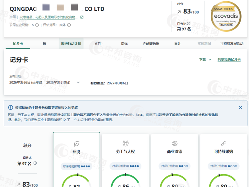 恭贺青岛XX油脂科技有限公司2026年3月EcoVadis取得83分的优秀成绩