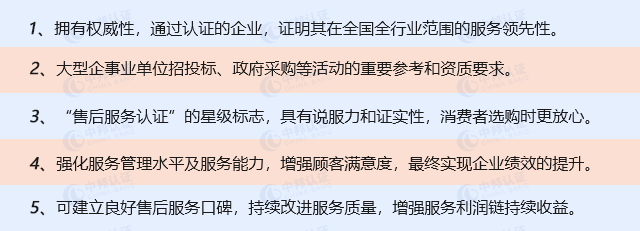 商品售后服务认证又称GB/T27922商品售后服务评价体系,可证明企业在全行业的服务领先性。表明其已获得消费者和市场认可。企业在产品及包装上使用服务认证星级标志,具有说服力和证实性,以便让消费者可以放心选购,同时也为大型项目招标、政府采购招标等方面提供资质证明。商品售后服务评价体系认证的核心内容是“评价指标”和“评价方法”两部分。“评价指标”部分主要是规定了用于商品售后服务评价的指标及其含义,具体分为三大类:针对售后服务体系的评价指标、针对商品服务的评价指标和针对顾客服务的评价指标。其中,针对售后服务体系的指标,强调企业在售后服务的组织、管理、资源等基础条件方面所做出的努力;针对商品服务的指标,强调对企业在围绕“商品”所开展的有关服务活动和服务行为的规范;针对顾客服务的指标,强调对企业在与顾客的交往过程中,应注重的服务问题和服务行为的规定。“评价方法”部分主要是规定了在售后服务评价活动执行过程中的基本程序和如何评分、如何计算评分值等问题。