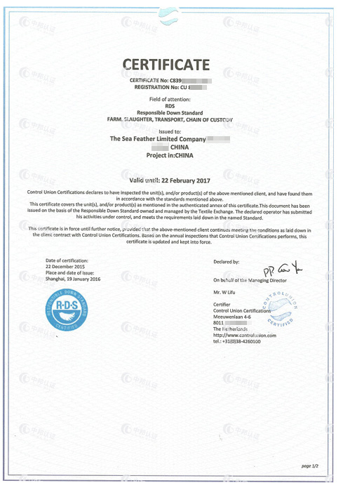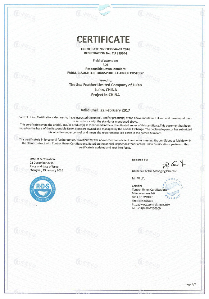 RDS负责任羽绒标准是由一直致力于服装和纺织品可持续发展的全球非盈利组织---纺织品交易所(TextileExchange)所主导,旨在用于纪录动物福利信息和确保羽绒制品可追踪性的标准。  除了早期的发起品牌The North Face外,Marmot、Mammut、Helly Hansen、Outdoor Research、Eddie Bauer及H&M等都已承诺践行这个标准,另有多个时尚、床品品牌也都积极加入。RDS标准认证的范围适用于从孵化到生产出来的最终产品的整条禽类供应链,并不受地域限制,该RDS认证适用于小农场--毛贩的渠道。该标准还包括对种禽养殖模块的认证,还适用于混合型和100%认证的产品。其中最终产品被标记为责任羽绒标准认证,