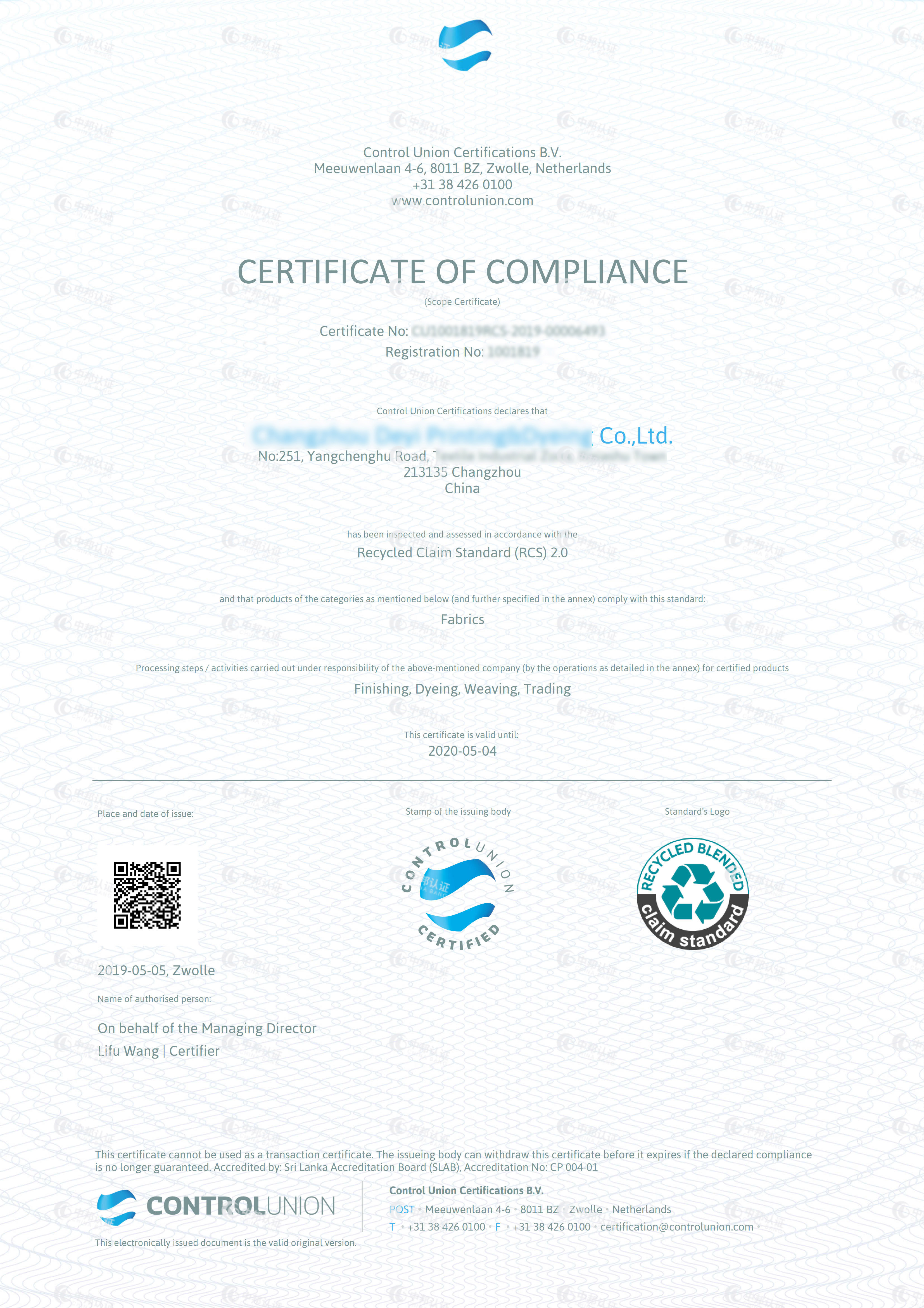 恭贺XX(江苏)包装材料有限公司2023年3月顺利通过RCS认证